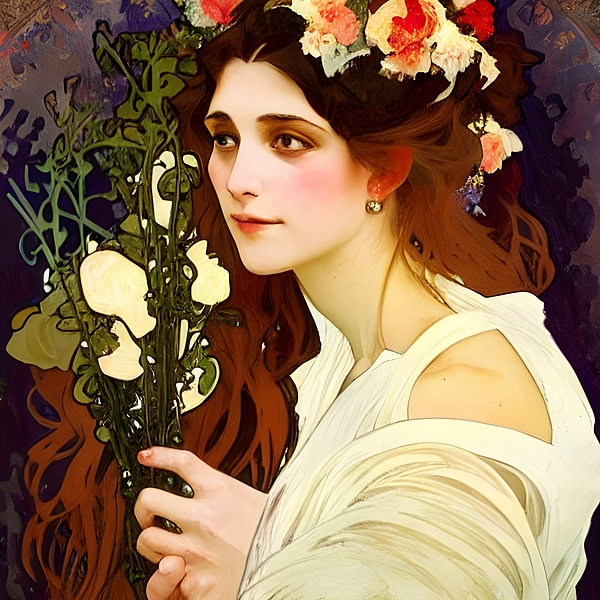 This lady with a crown of flowers in her hair looks like a poster beauty of the past, a tribute to all Art Nouveau poster lovers!