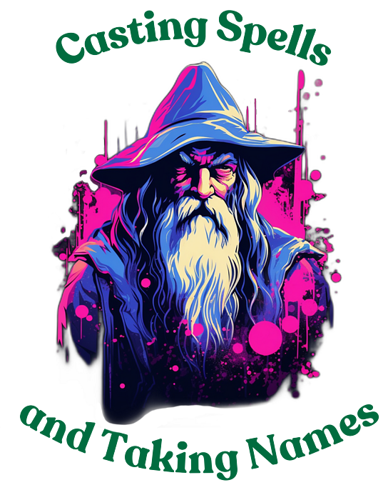 Whether you're a fan of RPGs, fantasy novels, or just have a knack for kicking butt in life, this is a design for you. This mystical wizard, dressed in vibrant colors, and surrounded by a magical splatter design, is surrounded by the text "Casting Spells and Taking Names". Dark background recommended.