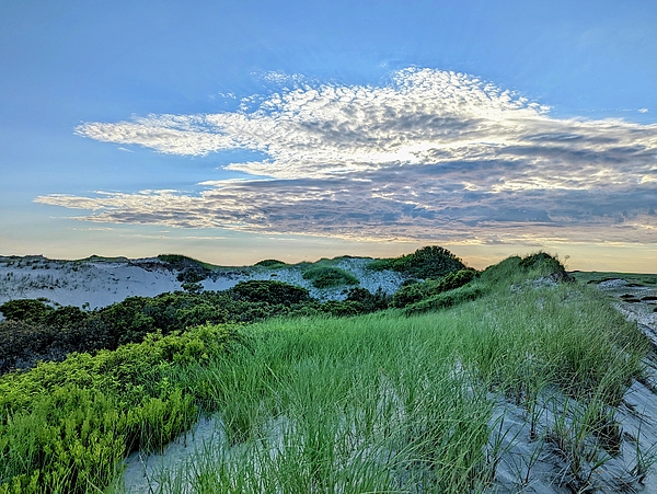 Transport yourself to the coastal dunes with vivid green grasses, and the setting sun lighting up the clouds in the sky. Photographed at the Cape Cod National Seashore.
